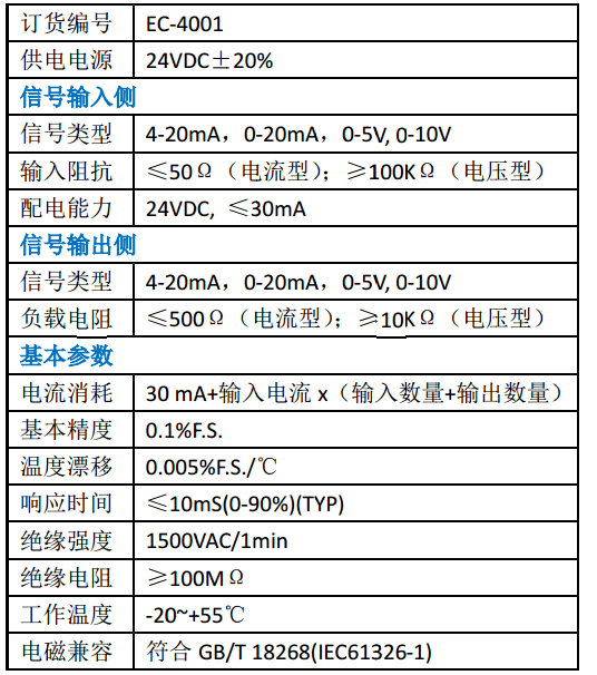 EC-4001是带配电输出的隔离器分配器系列产品,该系列产品采用DC24V供电,为现场的变送器提供隔离的配电电源,同时将变送器产生的电流信号从现场隔离传送到控制室、PLC、DCS等。输入端接口可电流源、二线制、三线制变送器通用;内部采用高线的词典隔离技术,输入、输出、电源之间相互隔离,具有高精度、高线性度、低温漂等特点。